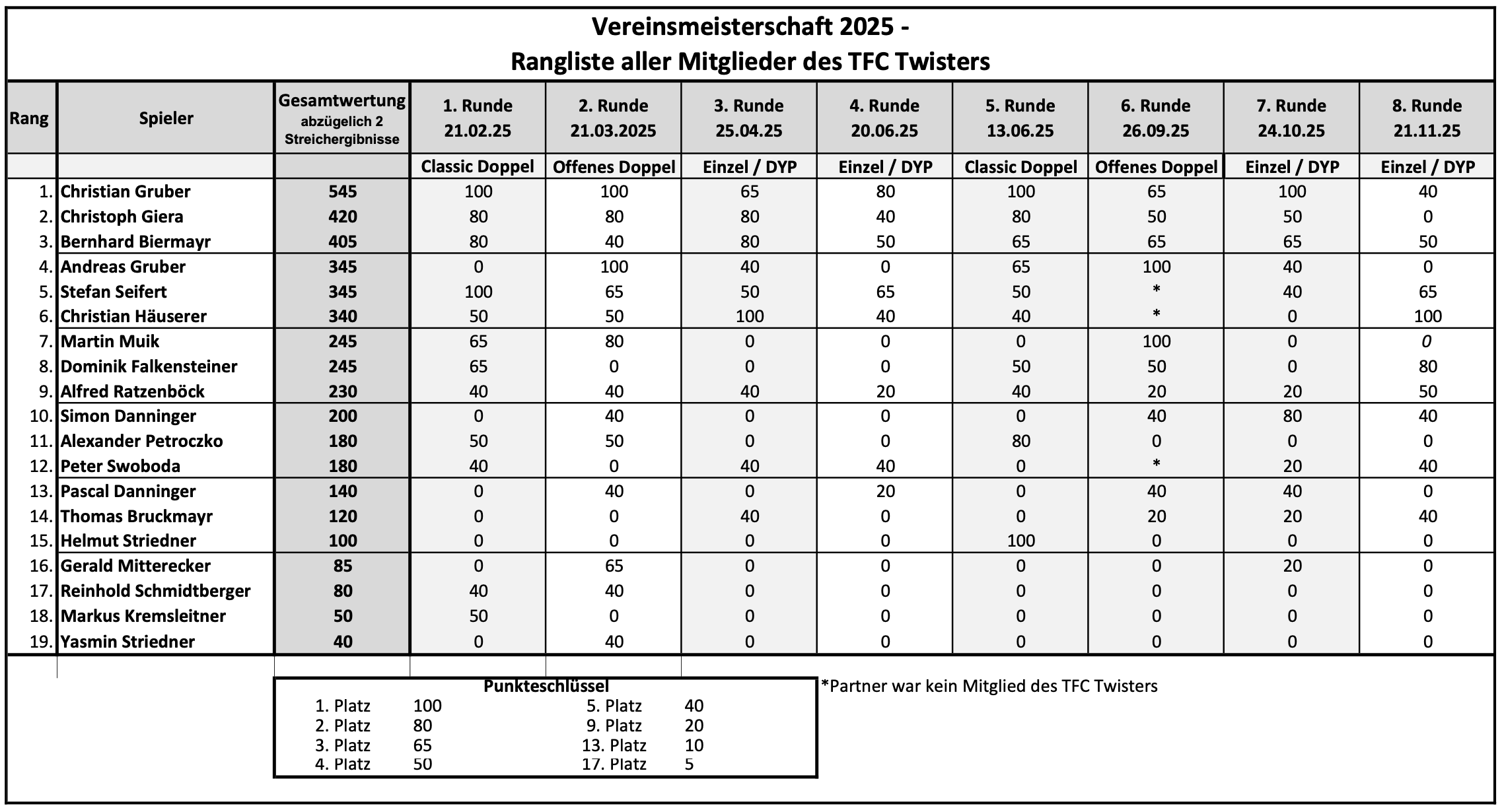 Hier findest du die Termine, die Ausschreibung und die Ranglisten der TFC Twisters Vereinsmeisterschaft.