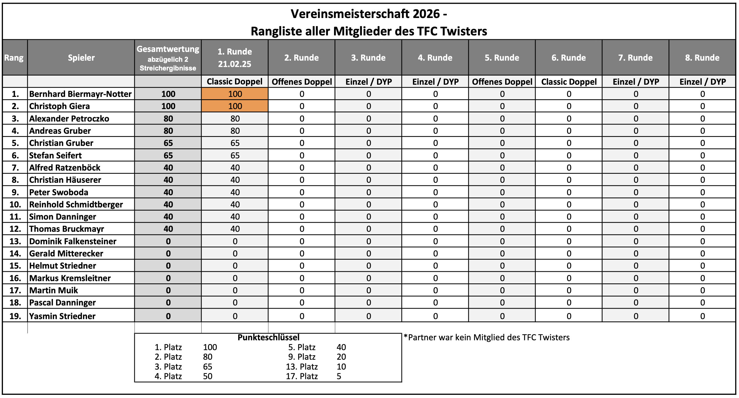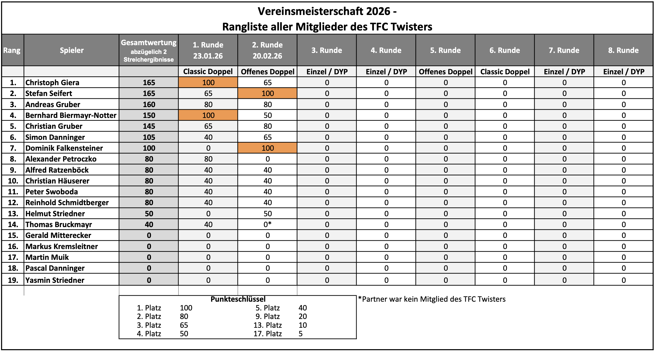 3. Du hast mit deinem Doppelpartner noch keinen anderen Bewerb im Rahmen der TFC Twisters Vereinsmeisterschaft bestritten.